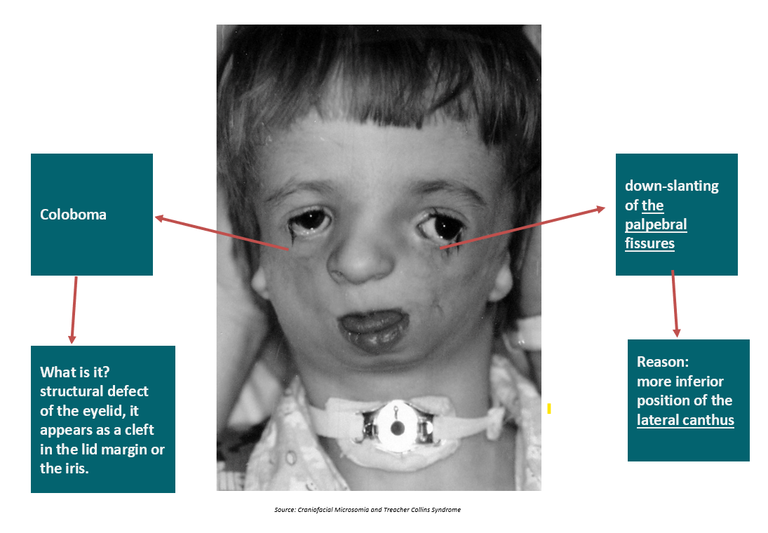 The incomplete or absent zygomatic arch along with an open lower orbital rim will give rise to a downward slanting of the eye.