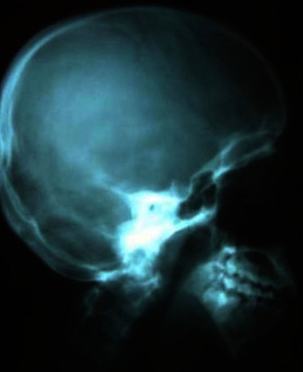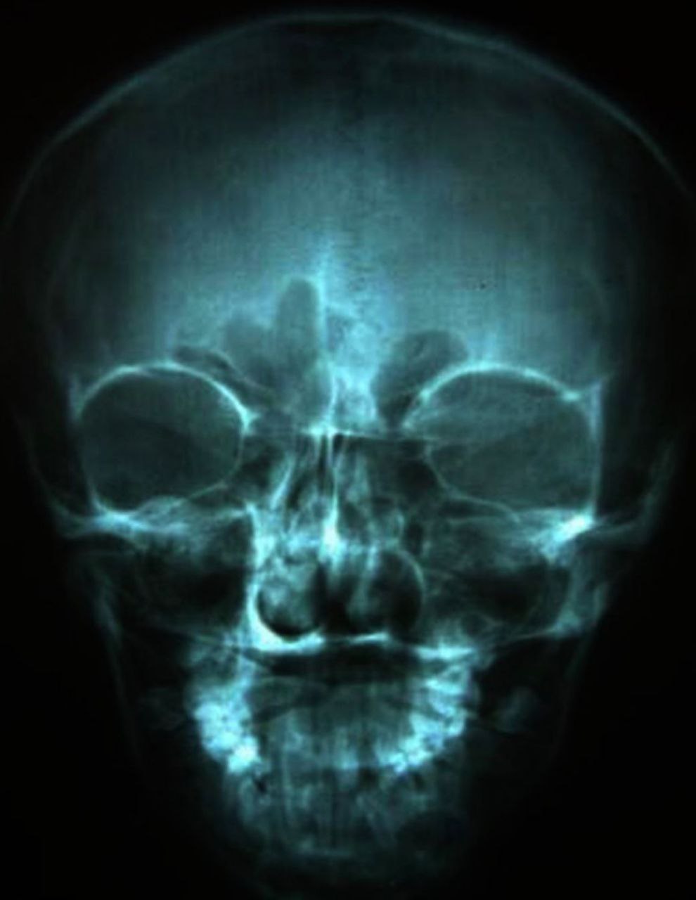 Posterioanterior skull showing mandibular and malar hypoplasia with hypertrophy of both maxillary sinus walls.
