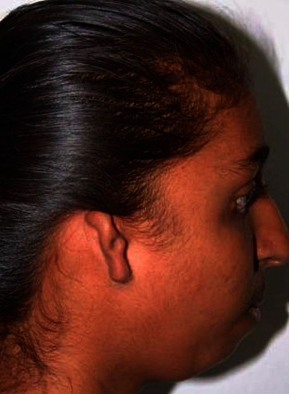Profile photograph of the patient demonstrated mandibular and zygomatic hypoplasia and antimongoloid slant of eyes.